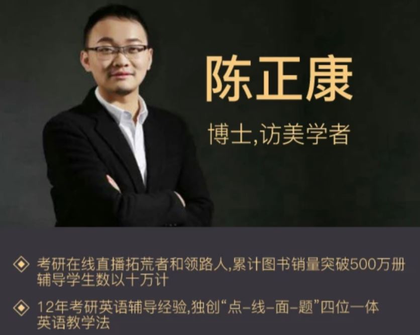 名师简介: 陈正康老师博士 考研英语在线直播领路人,辅导学生逾百万人。 13年考研英语教学经验,深谙命题规律,授课直达要点、幽默风趣、激情澎湃。 考研英语畅销书《母词》《母句》《...