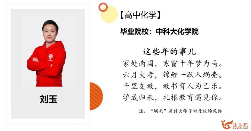某而思 刘玉 2019暑期高二化学凌云班 [高中化学] 毕业院校:中科大化学院 这些年的事儿 家处南国,寒窗十年梦为马。 六月大考,锦鲤一跃入蜗壳。 千里支教,教书育人为己乐。 学成归...