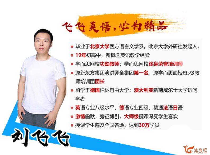 刘飞飞 2019寒初三英语直播菁英班(7讲带讲义) 人物简介编辑 刘飞飞,毕业于北京大学,学而思网校初中英语教师。编写教材作品,新东方《中考英语语法特训 教材》、《初中英语同步教材...