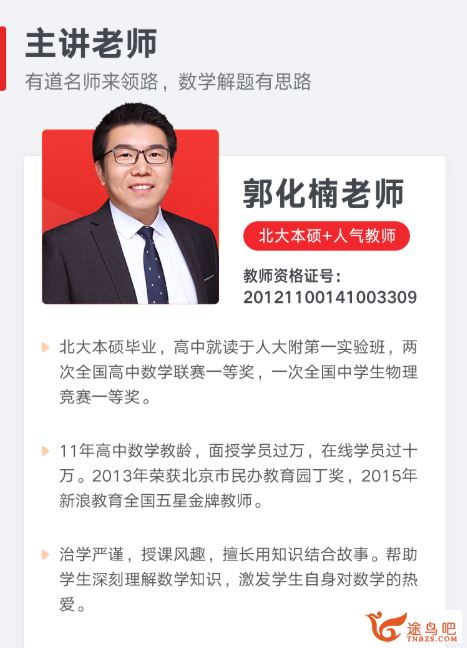 [南瓜数学]2020高考数学郭化楠二轮复习之目标双一流班 郭化楠,男,北京大学学士、硕士学位。 2007年毕业于北京大学信科科 学技术学院,现担任学而思网校高中数学教师。 所授课程被誉为...