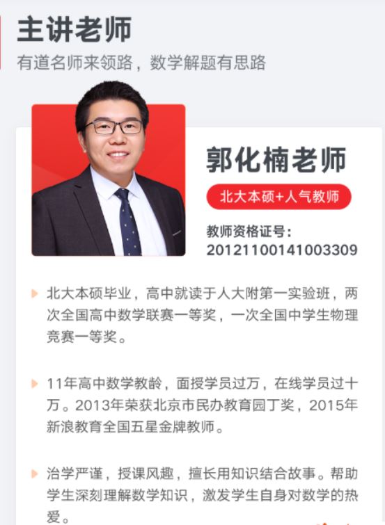 名师简介: 郭化楠,男,北京大学学士、硕士学位。2007年毕业于北京大学信科科 学技术学院,现担任学而思网校高中数学教师。所授课程被誉为“南瓜数学”。 中文名郭化楠国 籍中国民 族汉职...